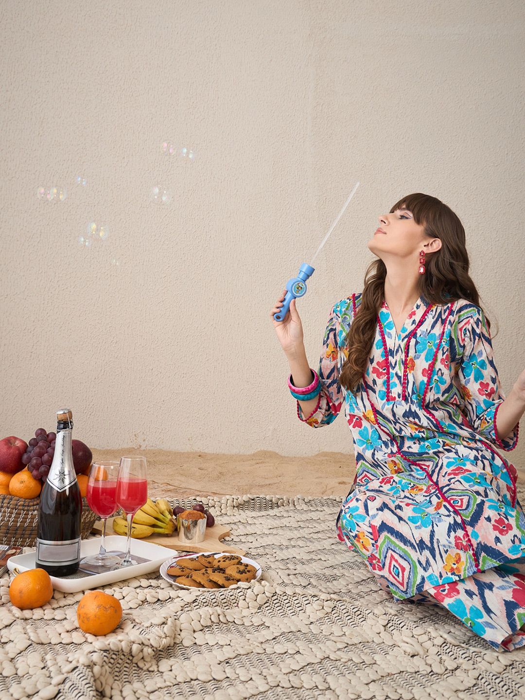 Dhiyona IE Floral Printed V-Neck Panelled Pure Cotton Straight Kurta With Trouser