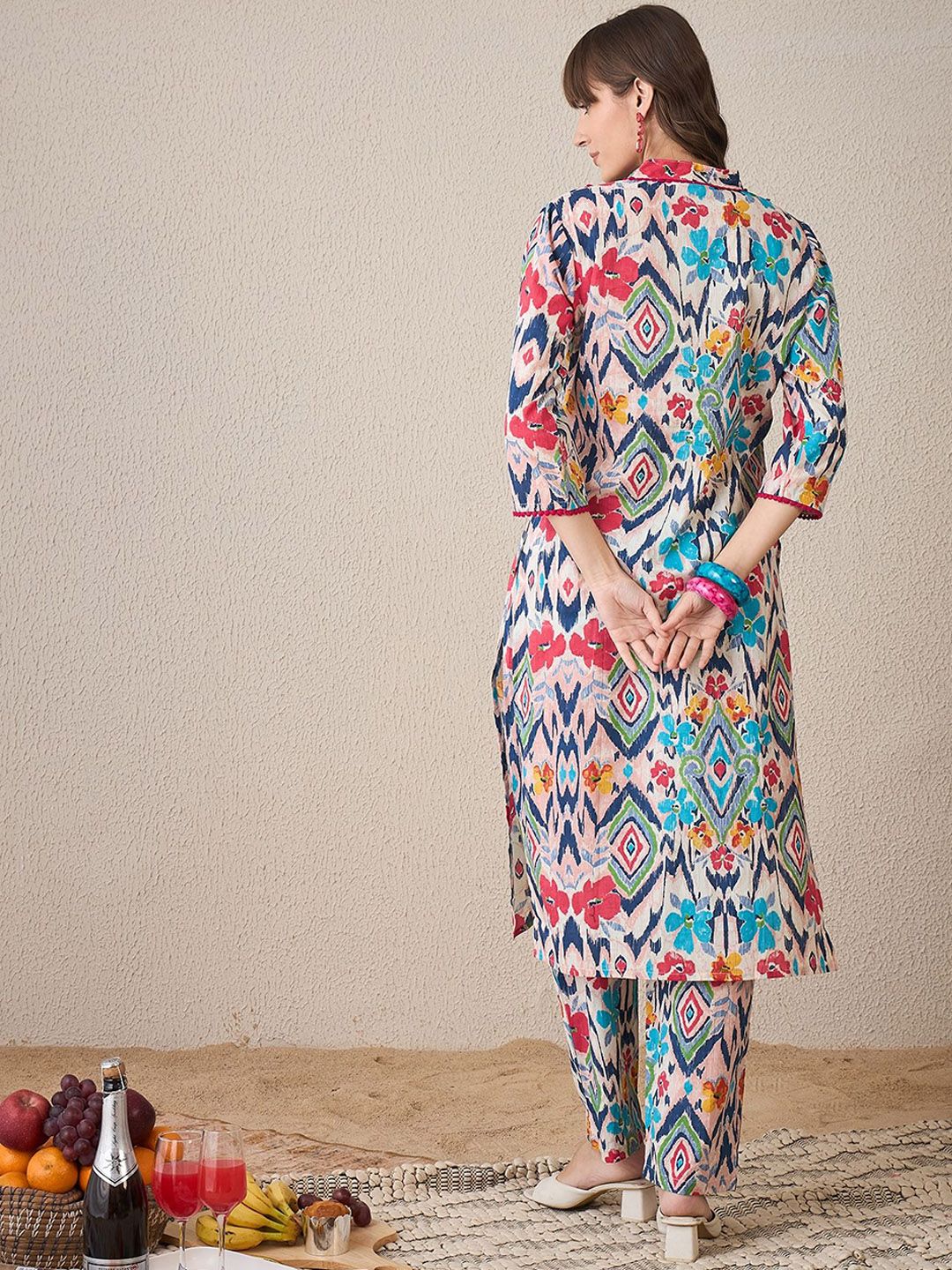 Dhiyona IE Floral Printed V-Neck Pure Cotton Tunic With Trouser