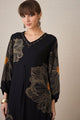 Black and cream-coloured printed a-line tunic, has v-neck, three quarter sleeves and slip-on closure