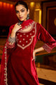 Red and gold-toned embroidered kurta with trousers and dupatta