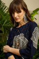 Navy-blue & cream coloured geometric printed top, has a round neck and three-quarter sleeves