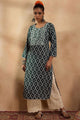 Dhiyona IE Green and White Round Neck Geometric Printed Mirror Work Straight Kurta