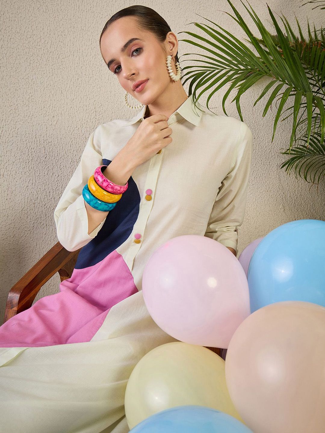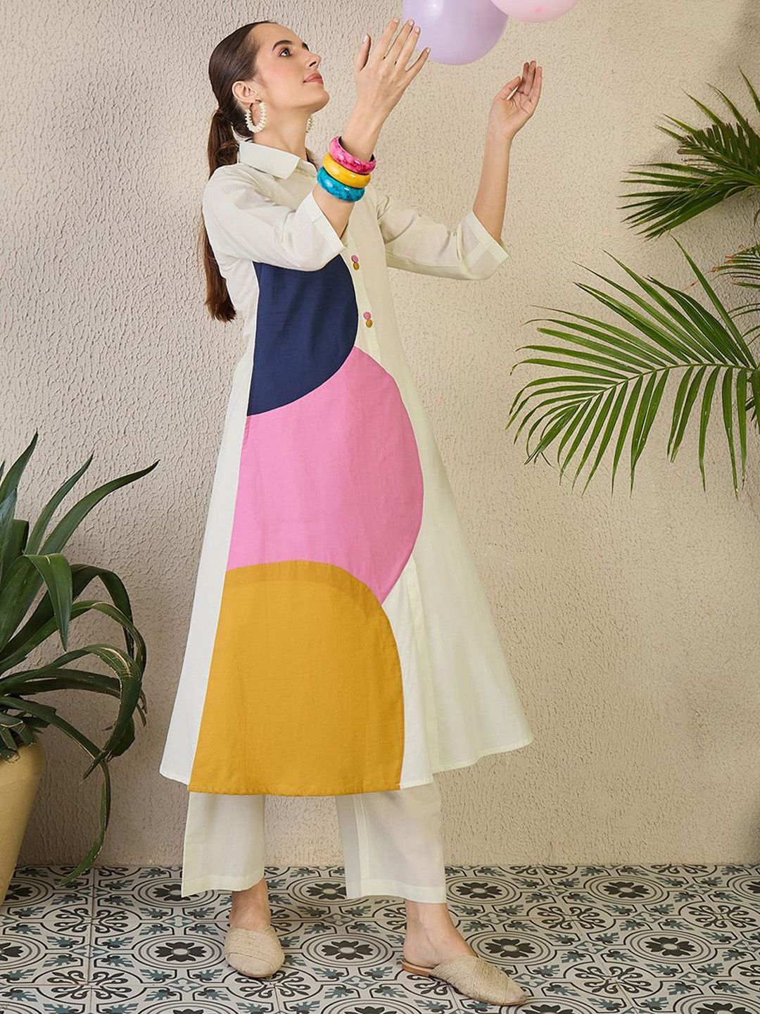 Off white printed A-line tunic, has a shirt collar with three-quarter sleeves