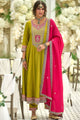 Olive green, , pink and beige embroidered kurta with trousers & dupatta