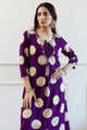 Purple and beige printed and embroidered tunic, has a round neck, and three-quarter sleeves, secured with slip on closure