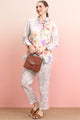 White and yellow printed and embroidered shirt, has a shirt collar neck and long sleeves