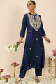Blue and white embroidered top, has a mandarin collar and three-quarter sleeves, secured with slip-on closure