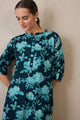 Teal blue and blue printed tunic, has mandarin collar neck, three quarter sleeves and button closure