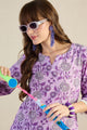 Purple printed trousers has an elasticated waistband with slip-on closure