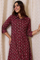 Maroon and white printed tunic, has a shrt collar and three quarter sleeves