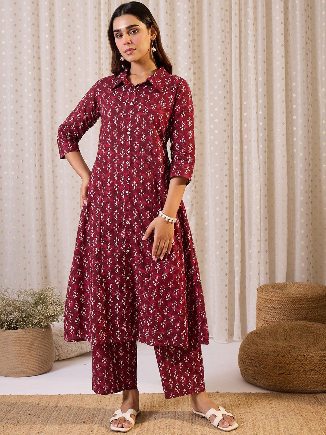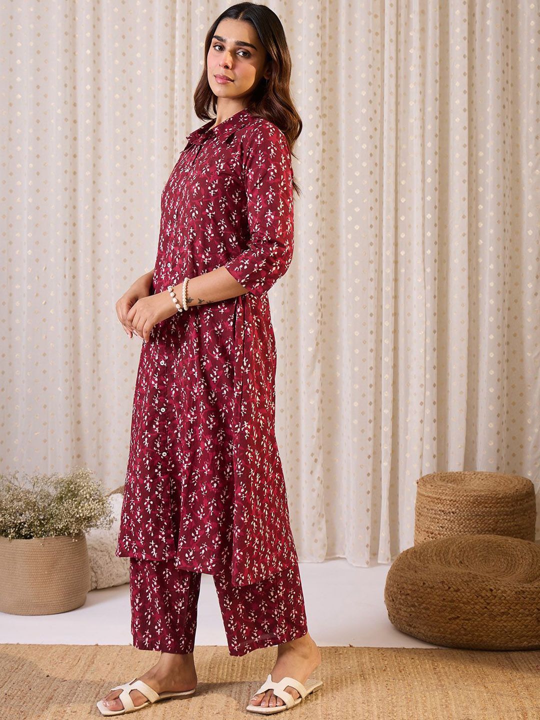 Dhiyona IE Printed Pure Cotton Shirt Collar Neck Tunic With Trousers