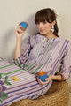 Purple and green printed top, has a round neck and three-quarter sleeves