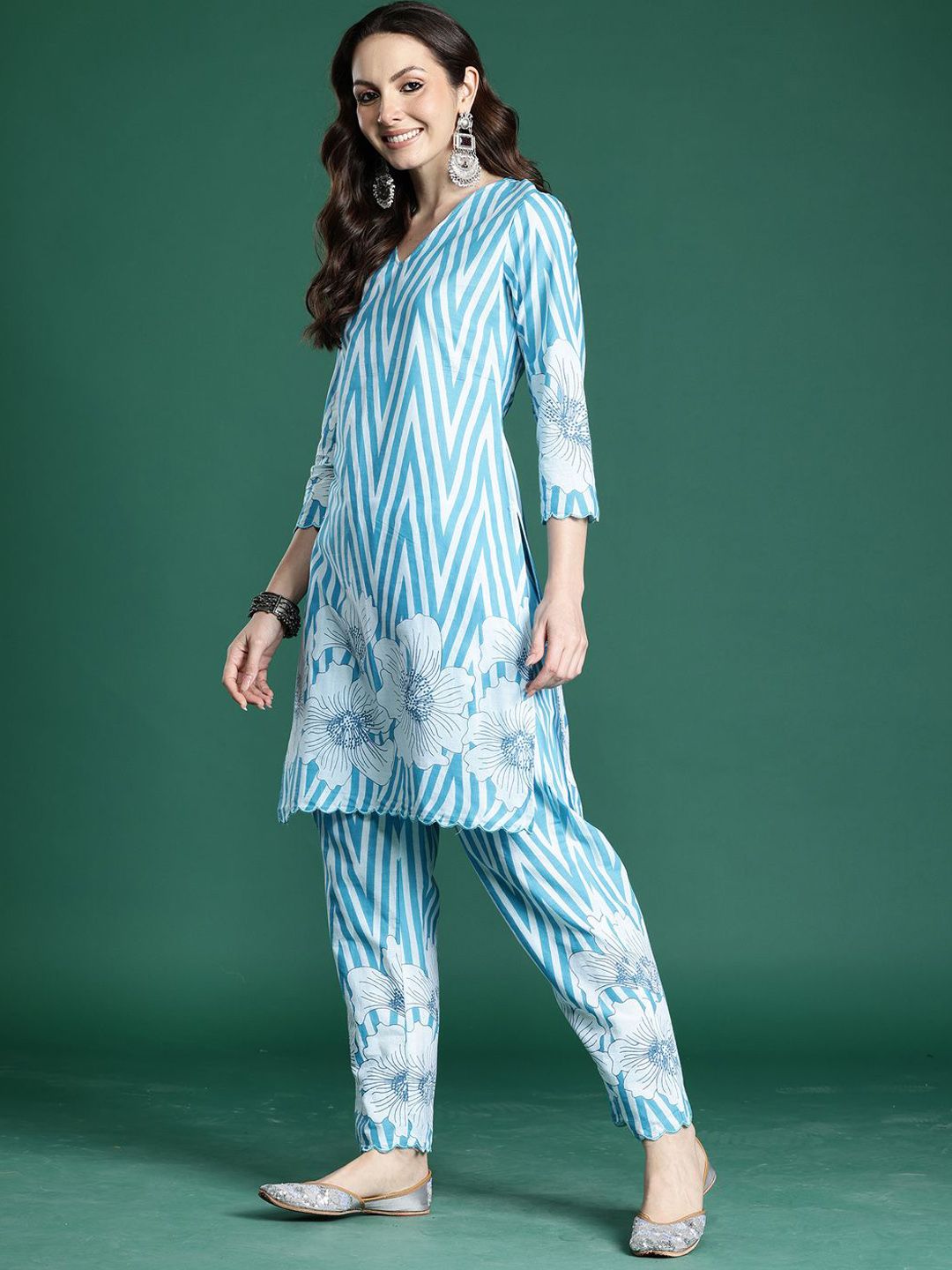 Dhiyona IE Printed Pure Cotton V Neck Top With Trousers Co-Ords