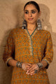 Mustard printed trousers, has an elasticated waistband with slip-on closure with 2 pocket