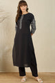 Black and white embroidered top, has a round- neck and three-quarter sleeves, secured slip-on closure