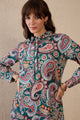 Green, white and pink printed straight tunic, has spread collar neck, three quarter sleeves and button closure