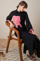Black and pink printed a-line tunic, has spread collar neck, three quarter sleeves and button closure