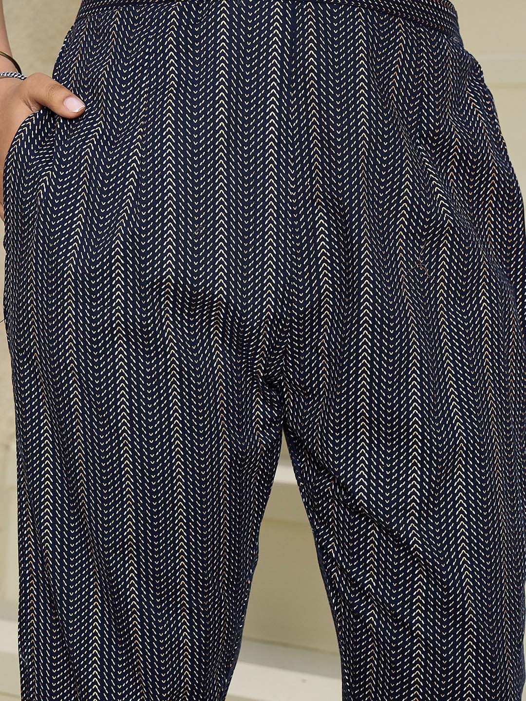 Navy blue, yellow and white printed trousers, has elasticated waistband with slip-on closure