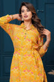 Mustard and green printed tunic, has v neck, three-quarter sleeves ,regular waist hem