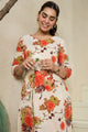 Off white and orange and green printed tunic, has v-neck, three quarter sleeves