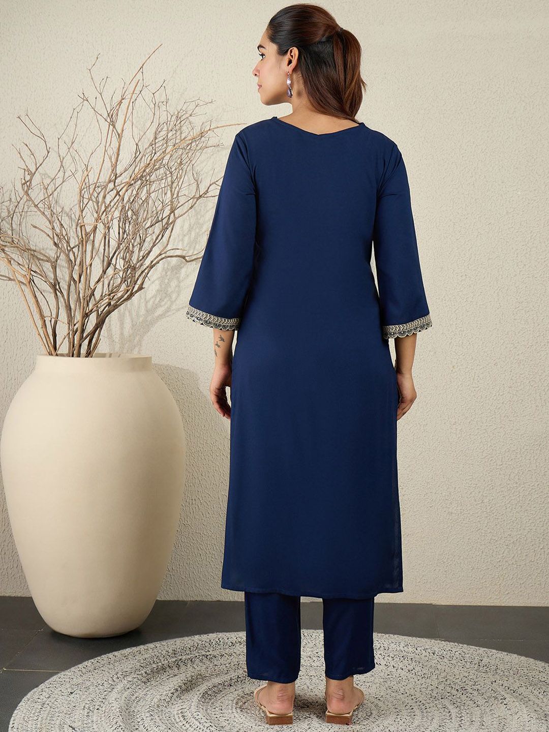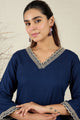 Navy blue & gold toned solid tunic, has a v-neck and three quarter sleeves