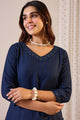 Navy blue solid tunic, has a v-neck and three-quarter sleeves, secured with slip-on closure