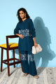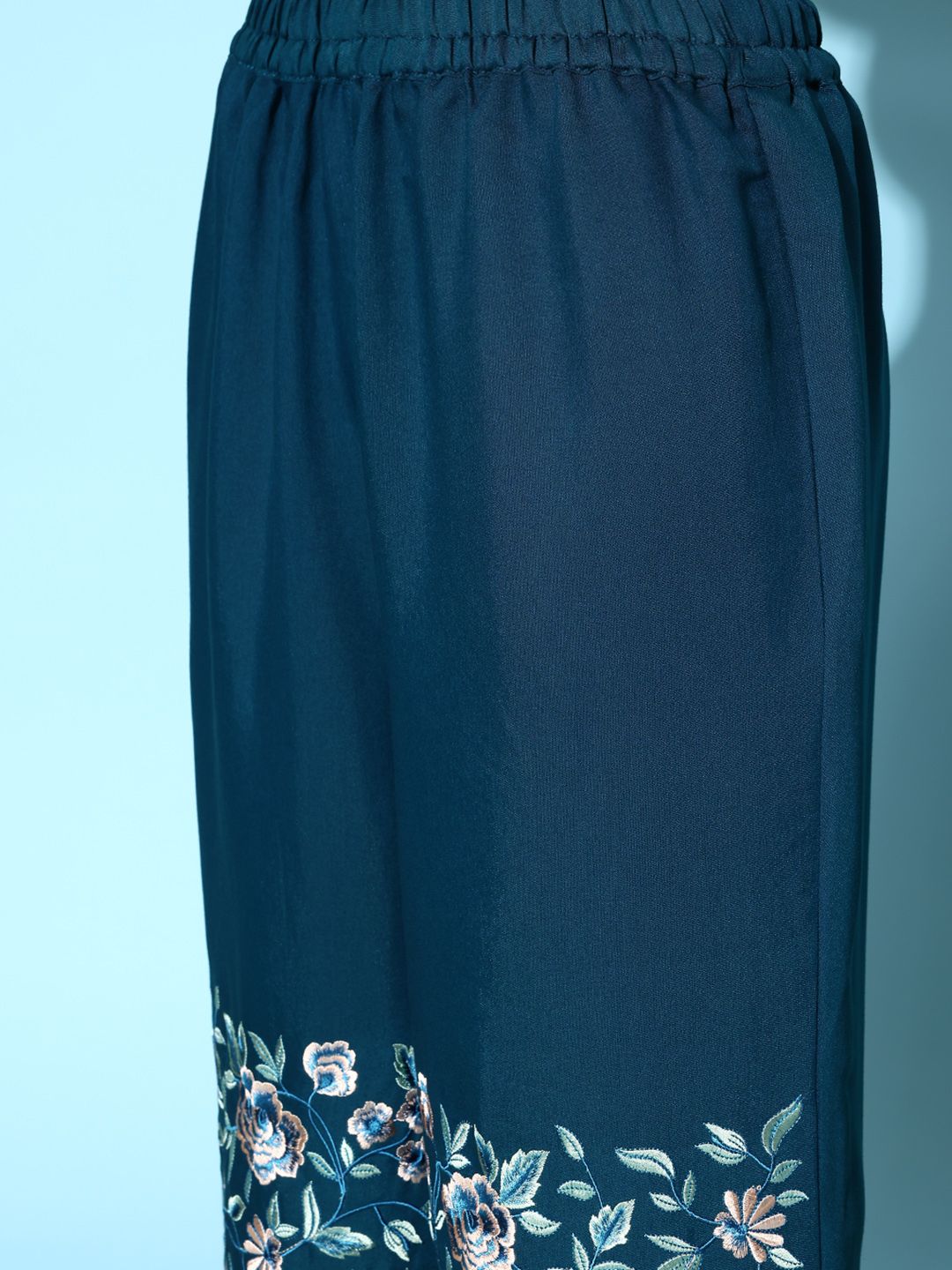 Teal blue floral embroidered tunic, has a mandarin collar, Three-quarter sleeves