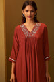 Rust & gold-tone embroidered kurta, has v-neck, three quarter sleeves, slip-on closure and flared hem