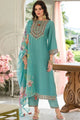 Turquoise Blue, Pink, Silver Embroidered Kurta with Trousers & Dupatta