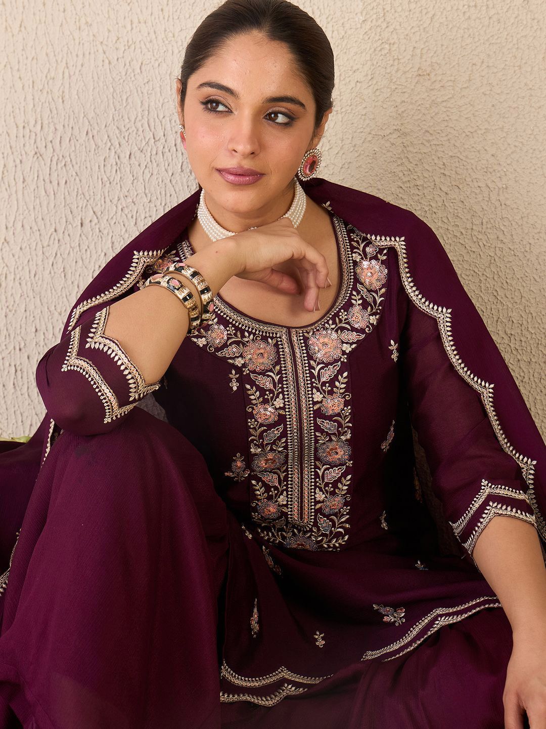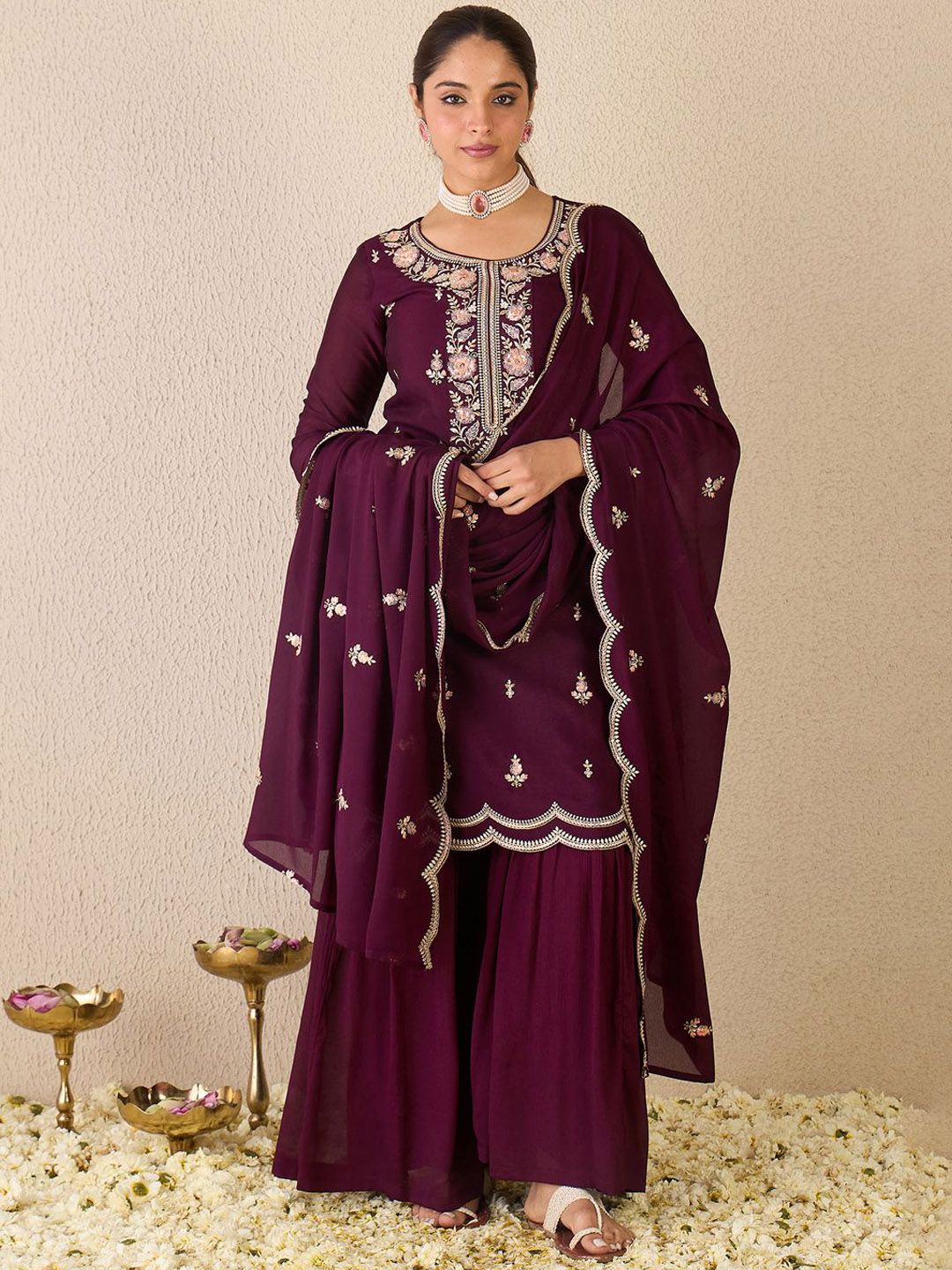 Dhiyona IE Women Ethnic Motifs Embroidered Regular Sequinned Kurta with Sharara & With Dupatta