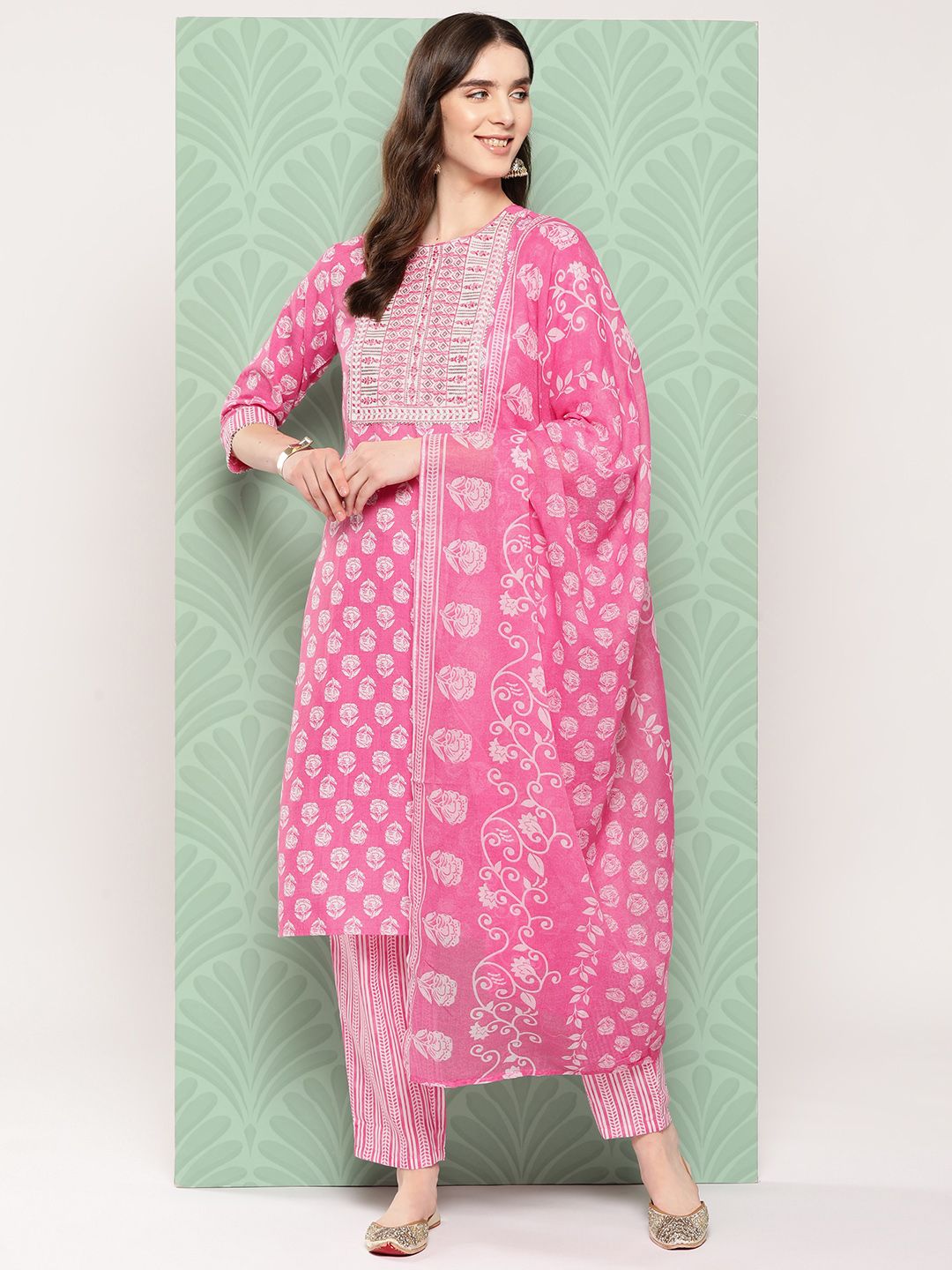 Pink printed Kurta with Trousers with dupatta