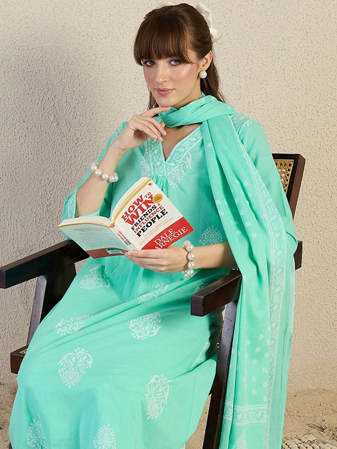 Dhiyona IE Women Floral Printed Regular Pure Cotton Kurta with Trousers & With Dupatta