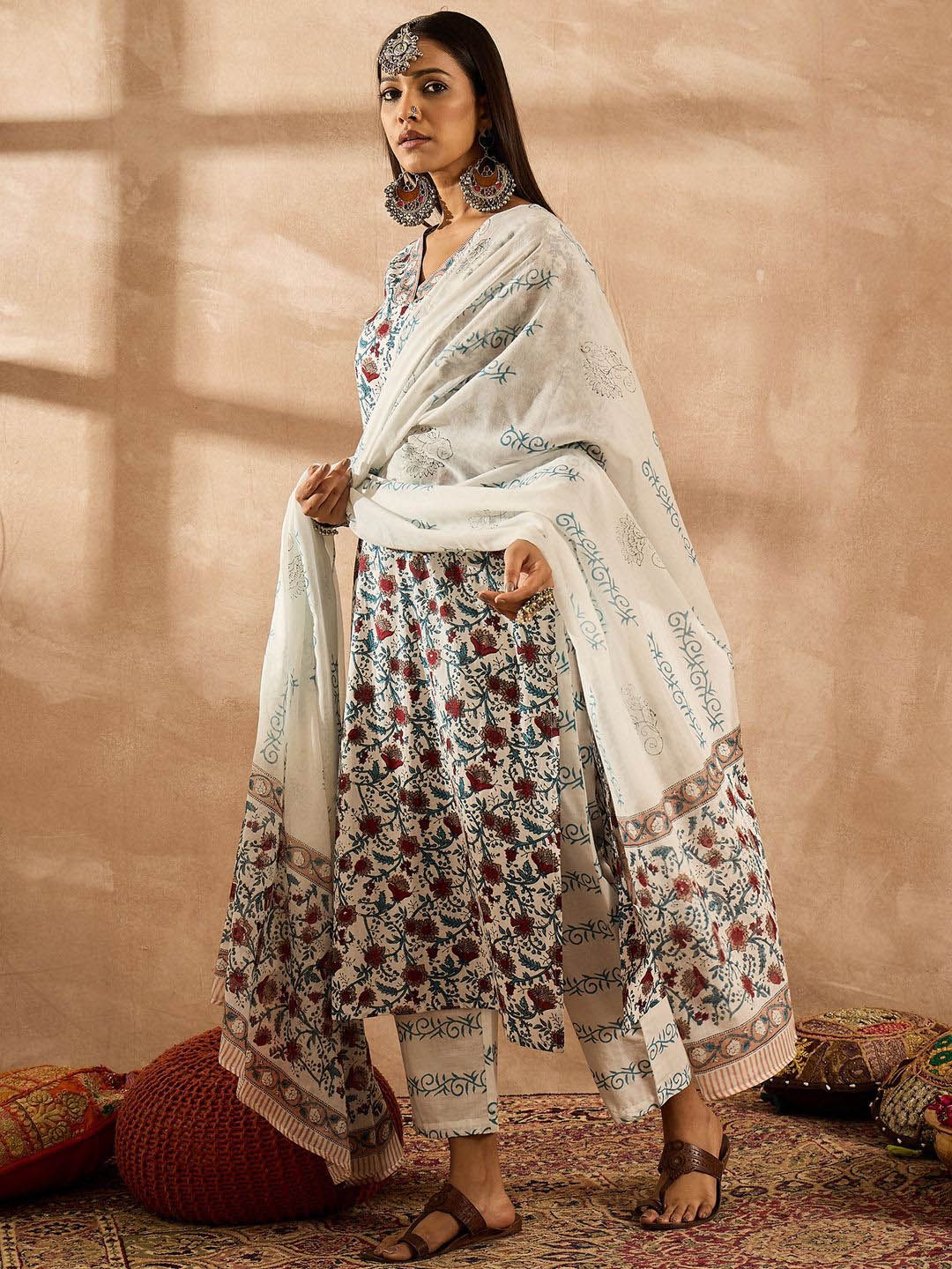 Dhiyona IE Women Floral Printed Regular Pure Cotton Kurta with Trousers & With Dupatta