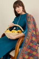 Teal, Brown, White Embroidered Kurta with Trousers & Dupatta