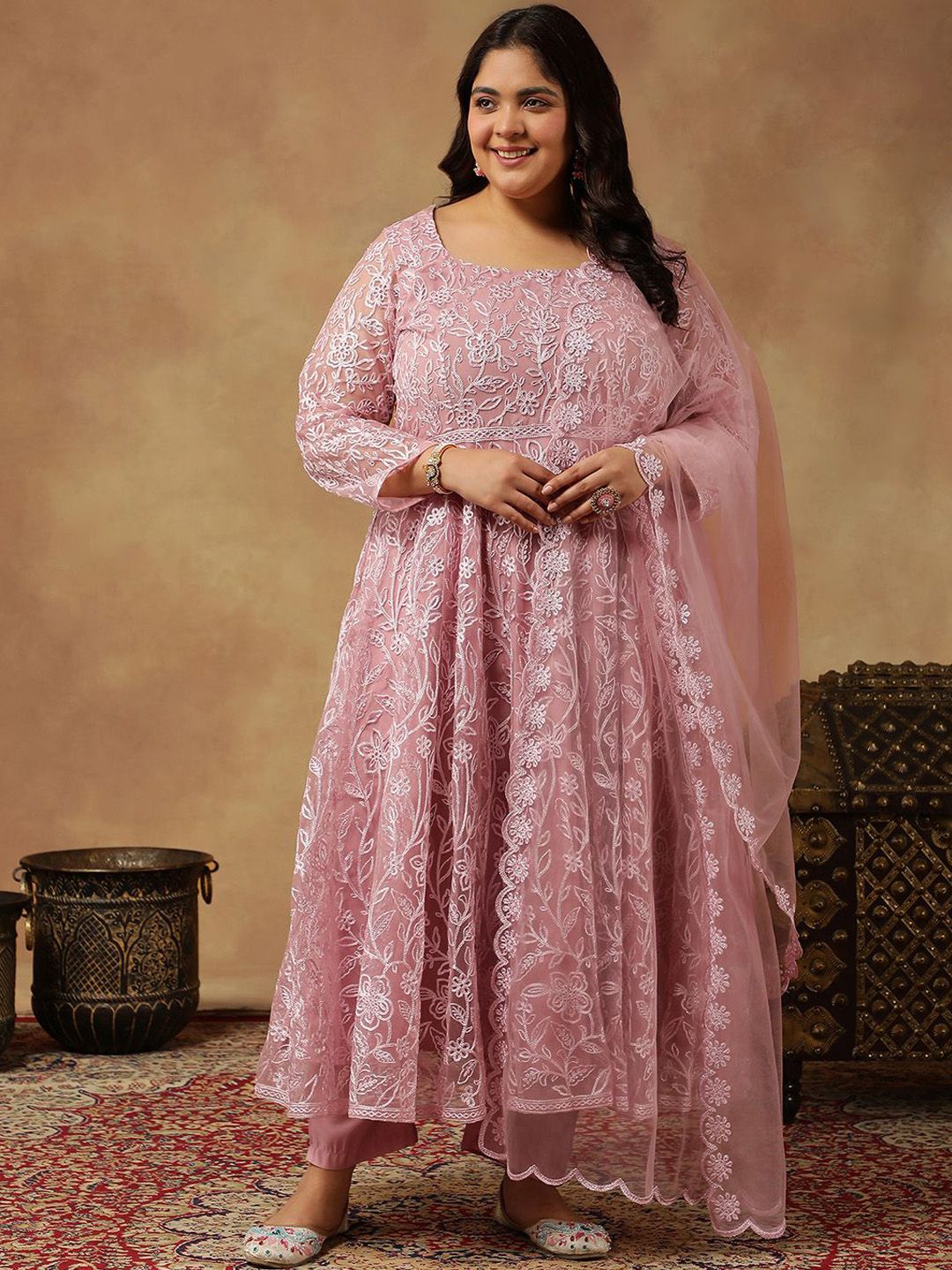Dhiyona IN Floral Embroidered Regular Thread Work Anarkali Kurta With Trousers & Dupatta