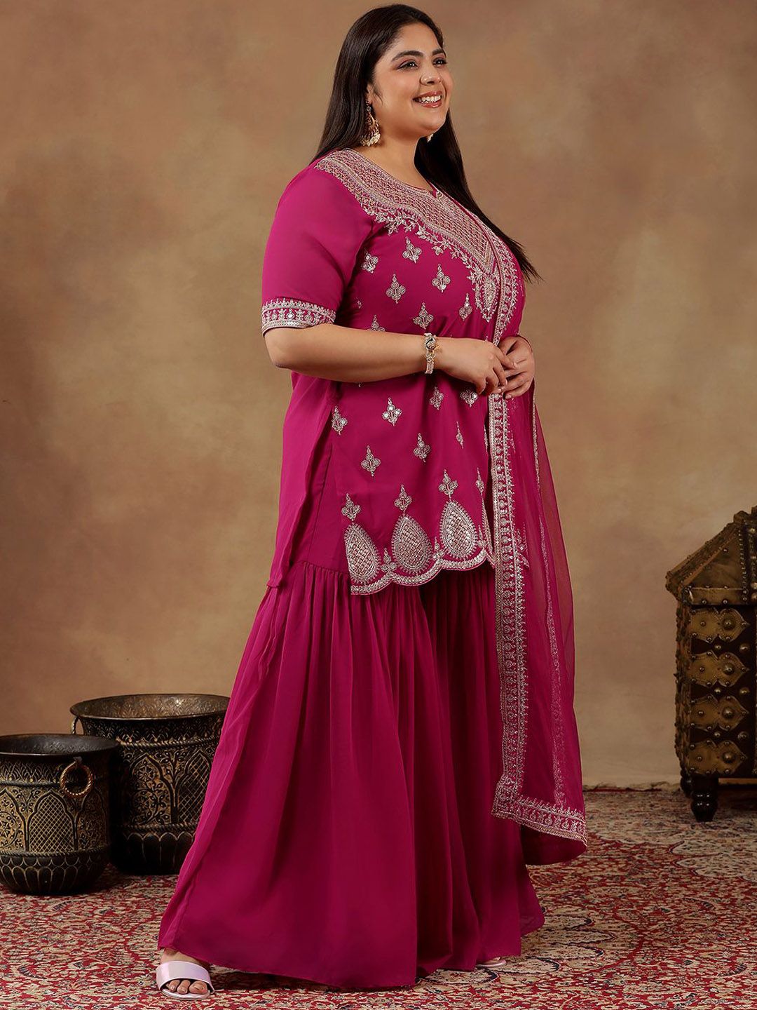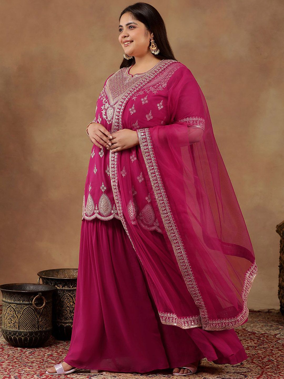 Dhiyona IN Plus Size Embroidered Sequin Georgette Straight Kurta With Sharara & Dupatta