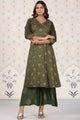 Dhiyona OD Olive Green & Gold Printed V Neck Angrakha Kurta With Palazzos