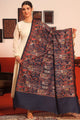 Navy blue and pink ethnic motif embroidered woollen shawl has a fringed border