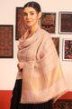 Beige and gold-toned checked woven design woollen shawl has a fringed border
