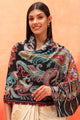 Black ethnic motifs embroidered woollen shawl has a solid border