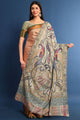 Grey and blue ethnic motifs embroidered woollen shawl has a solid border