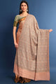 Pink and green ethnic motifs embroidered woollen shawl has a solid border