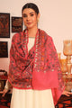 Pink and yellow ethnic motifs embroidered woollen shawl has a solid border