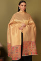 Beige, green and red ethnic motifs woven design woollen shawl has a fringed border