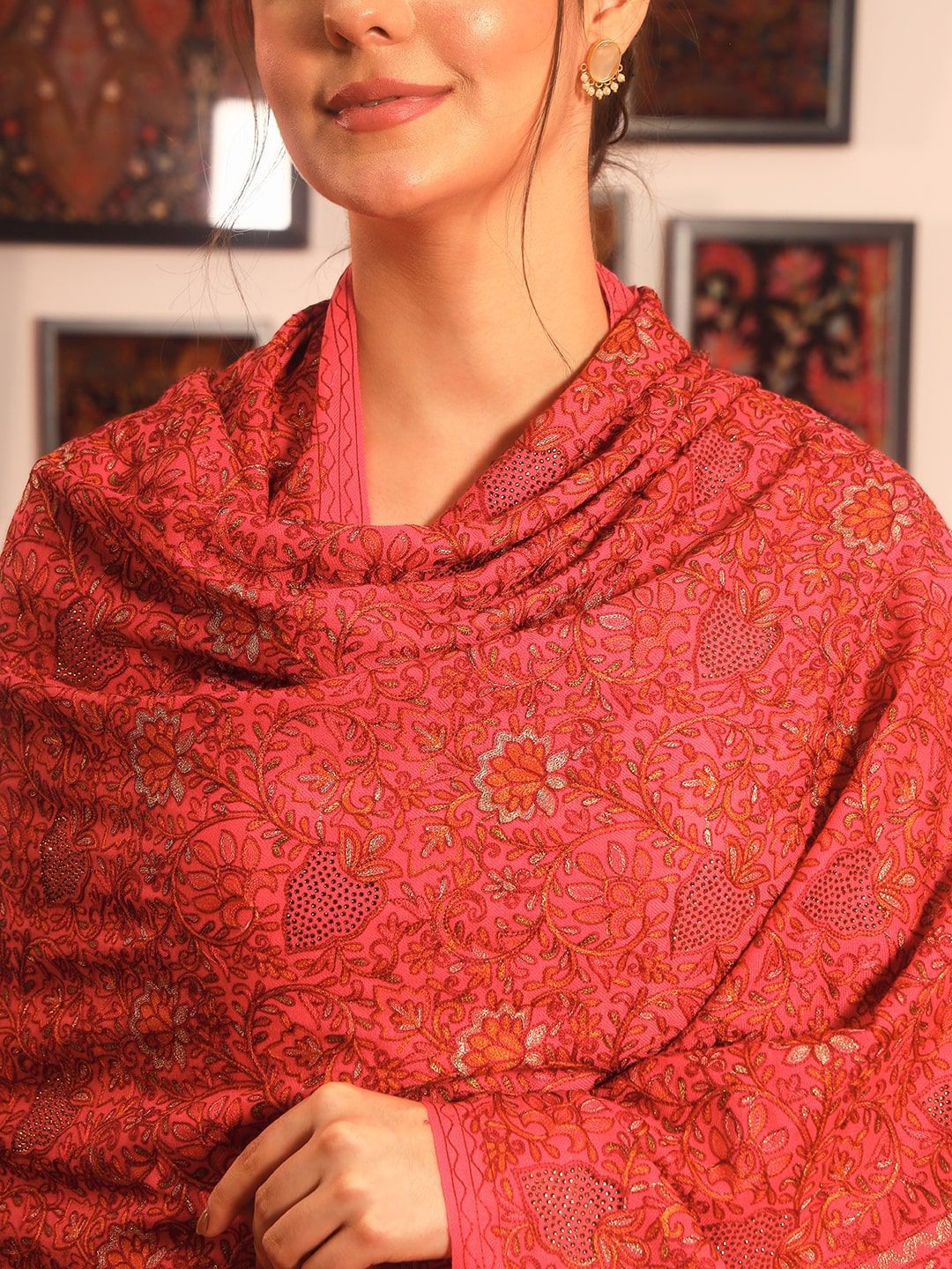 Pink, white and orange floral embroidered shawl has a tasselled border