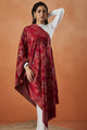 Maroon and mustard & blue foral woven design viscose rayon shawl has a fringed border