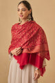 Maroon and gold-toned floral woven design woollen shawl has a fringed border