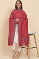 Pink floral woven design shawl, has fringed border