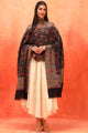 Black and green, pink floral woven design woollen shawl has a fringed border
