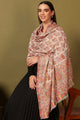 White and pink paisley woven design woollen shawl has a fringed border